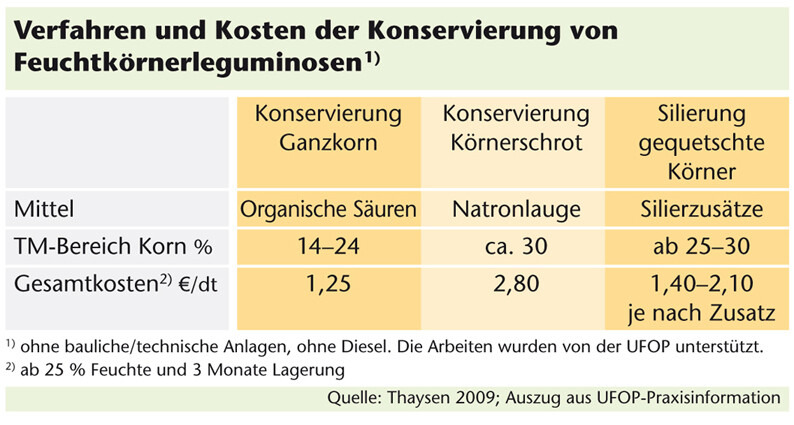 Eine Alternative stellt die Feuchtkonservierung von Ackerbohnen, Futtererbsen oder Blauen Süßlupinen dar, die über Säure oder Natronlauge erfolgen kann. Ebenfalls möglich ist die Silierung. Untersuchungen mit diesen Verfahren wurden für die drei Fruchtarten in den Jahren 2007 und 2008 von der Landwirtschaftskammer Schleswig-Holstein mit gutem Erfolg durchgeführt. In Tabelle 3 sind einige Daten zu den verschiedenen Verfahren dargestellt, die als Richtwerte verstanden werden können. Die Konservierungsverfahren können von Lohnunternehmen oder von Unternehmen, die im Bereich der Tierernährung tätig sind, durchgeführt werden. Von besonderem Interesse dürfte die Ganzkorn-Konservierung sein.