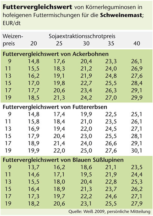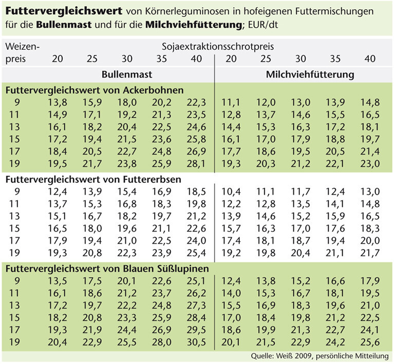 Bei den hohen Preisen für Sojaschrot sind die Futterwerte der heimischen Eiweißpflanzen beträchtlich. Sie liegen je nach Verwertungsrichtung und Einsatz zum Teil um mehrere EUR/dt über den handelsüblichen Marktpreisen. In den Tabellen 1 und 2 sind Anhaltspunkte für den Futterwert der drei Fruchtarten für den Einsatz in der Bullenmast, in der Milchviehfütterung und in der Schweinemast gegeben.
