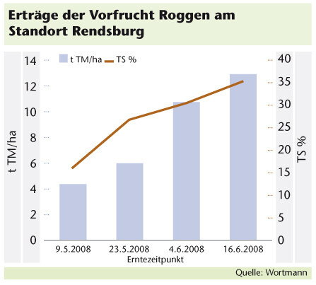 In Moosburg wurde Grünroggen mit 6,3 t TM/ha bei 19 % TS und Roggen-GPS mit 8,9 t TM/ha bei 32 % TS geerntet. Das Niveau war geringer als 2007.