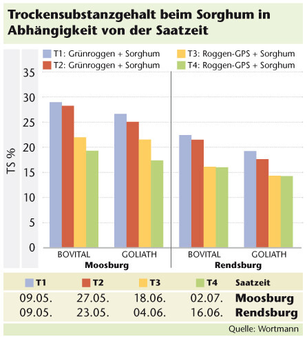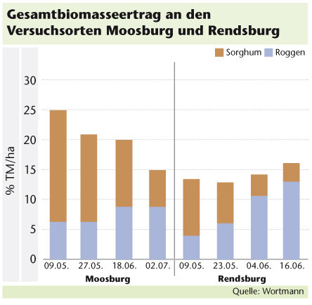 In einem Fruchtfolgeversuch an den Standorten Moosburg (Bayern) und Rendsburg (Schleswig-Holstein) konnten dazu interessante Ergebnisse gewonnen werden. Angebaut wurden die beiden Sorghumsorten GOLIATH und BOVITAL zu vier verschiedenen Aussaatzeitpunkten nach Grünroggen (erster und zweiter Saatzeitpunkt) und Roggen-GPS (dritter und vierter Saatzeitpunkt).