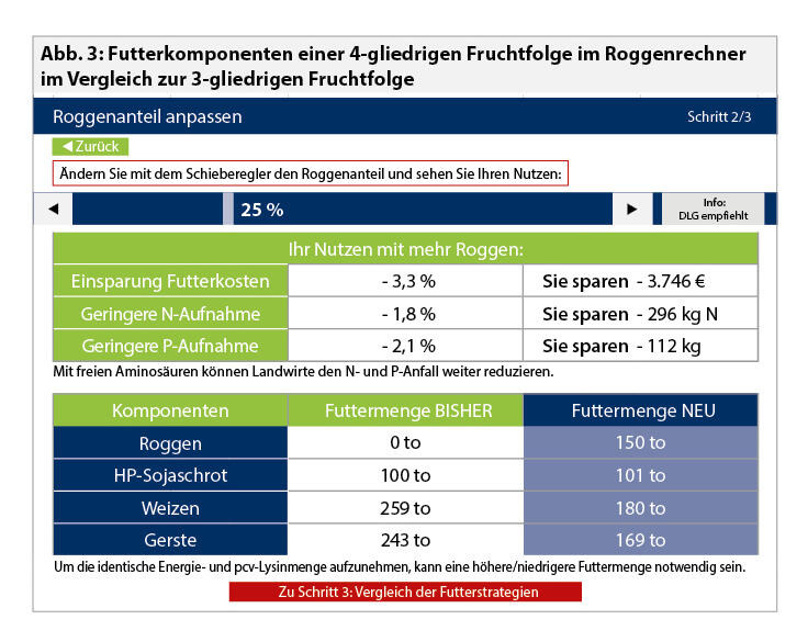 Die viergliedrige Fruchtfolge unseres Beispiels erlaubt es im Unterschied zu der dreigliedrigen, den Roggenanteil in der Hauptkomponenten-Kombination auf bis zu 25 % zu erhöhen (s. Abb. 3). In der Folge werden ca. 3.700 Euro der Futterkosten eingespart, wenn man die aktuellen Erzeugerpreise zugrunde legt. Außerdem fallen 1,8 % bzw. 2,1 % weniger N und P in der Fütterung der Schweine an. Den Roggenanteil mit dem Regler noch höher zu veranschlagen, führt zu weiteren Kostensenkungen. Die Größenordnung der Kosteneinsparung wird natürlich stark durch die herrschenden Marktpreisverhältnisse bei den Hauptkomponenten bestimmt. Die Obergrenze des Roggenanteils in der Fütterung hängt von den vertretbaren Einmischanteilen in den Fütterungsphasen ab1. Als Orientierungswert kann die DLG-Empfehlung herangezogen werden.